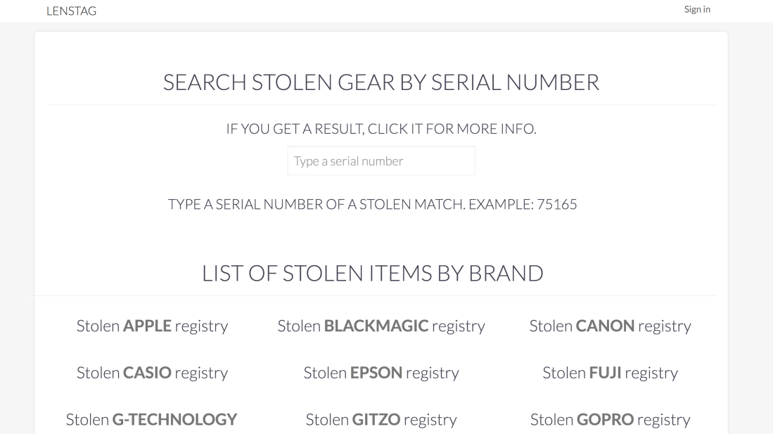- Lenstag’s goal is to make it not worth it for thieves to take the time to steal cameras, lenses and everything related. If there is no market for stolen photo and video equipment, they’ll steal something else. Maybe a stereo, maybe a car, but whatever. Stereotag and Cartag can deal with that. Why do photographers have to be only the artists that get their tools stolen? We can fix this so sign up now if you haven’t yet and update your gear list if you have. You don’t want to be that guy or gal that has the police bang on their door to take away gear that belongs to someone else.